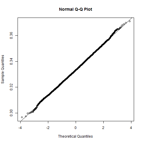 When I ran this code I got mean(a) = 0.3333875, sd(a) = 0.00993982. Furthermore, the computed values of a are roughly normally distributed, as shown by this histogram and Q-Q plot. (The line on the Q-Q plot passes through the point (0, mean(a)) and has slope sd(a).)