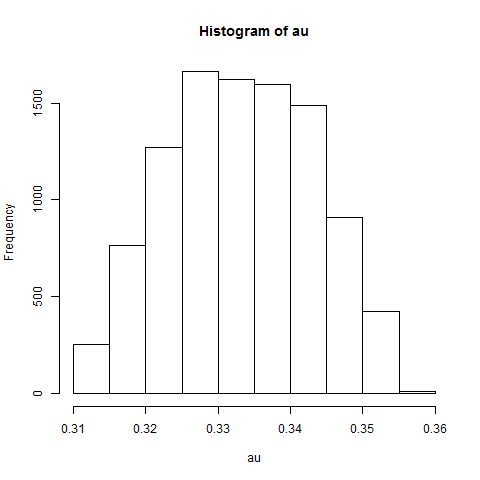 I got mean(au) = 0.3332557 and sd(au) = 0.009936519. The distribution of the simulated results is a bit unusual-looking: