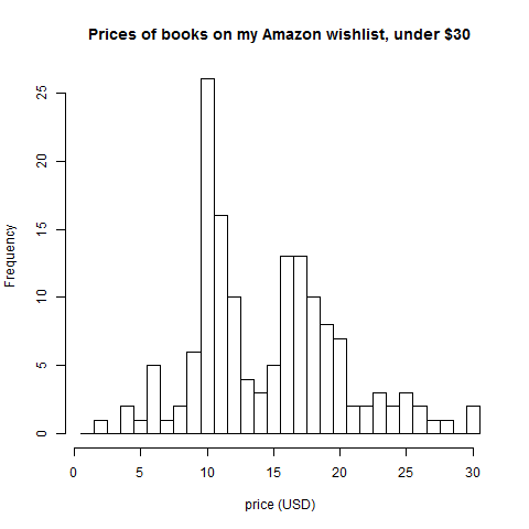 But the median price of a book on my wishlist is (again to the nearest whole dollar) $16; the difference between the median and the mean is a hint that the distribution is skewed. And there are actually two peaks — one centered on $10 and one centered on $16-17. The distribution looks like this: