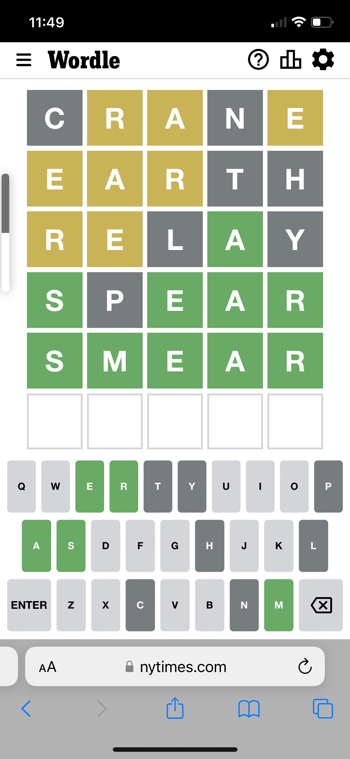 So what should my fourth guess be? WordleBot, the New York Times tool for analyzing Wordle play, says that after guessing RELAY, there are three possible solutions, SMEAR, SPEAR, and SWEAR. I believed these were three possible solutions but couldn’t be sure they were the only ones.