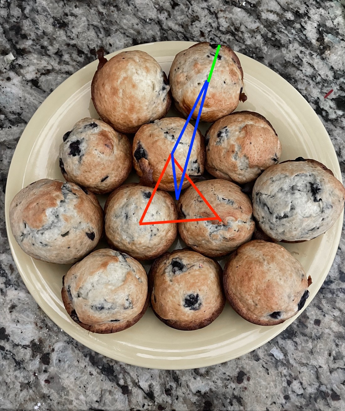 As it turns out, the packing I discovered isn’t all that far off from this constant. Let the radius of the muffin be 1, and draw triangles as below.